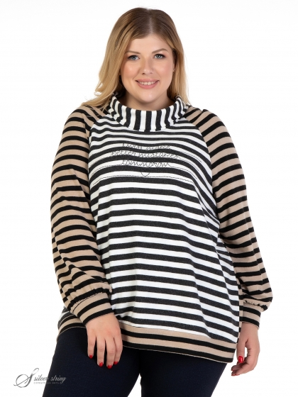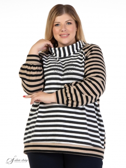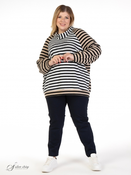 Джемпер прямого силуэта изготовлен из трикотажных полотен с рисунком в полоску разного цвета. Модель с длинным, объемным рукавом, покроя реглан. Понизу рукав присобран на круговую манжету из основного материала. Низ изделия обработан притачным поясом. Линия горловины оформлена мягким воротником типа «хомутик». Полочка декорирована термоаппликацией из миниатюрных страз. В модели учтены особенности фигуры дам нестандартных размеров. Блуза станет базовой вещью в Вашем гардеробе.
