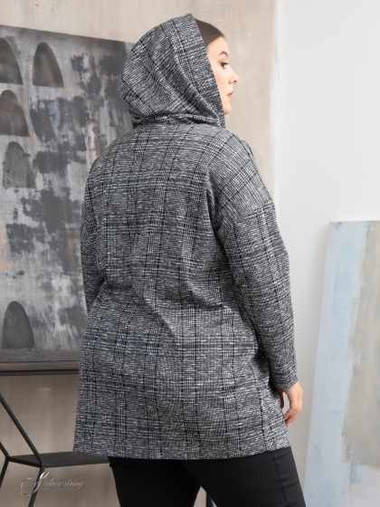 Туника прямого силуэта, с удлиненной линией плеча, выполнена из трикотажного полотна с рисунком в клетку. Модель с притачным капюшоном на углубленной горловине. Рукав длинный, суженный к низу. Удобный крой модели скроет возможные недостатки фигуры и позволит чувствовать себя комфортно при любых обстоятельствах.