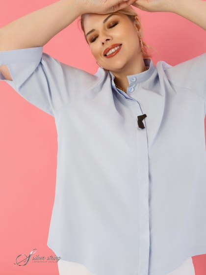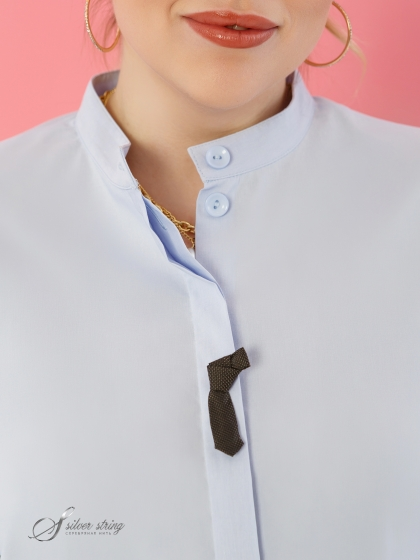 Оригинальная Блузка-рубашка в стиле «Smart-casual» изготовлена из смесовой эластичной ткани с высоким содержанием хлопка. Модель с супатной застежкой на пуговицы и воротником-стойкой. Рукав втачной, длиной до локтя. По низу рукава заложена широкая бантовая складка и притачена манжета без застежки, что придает изделию легкую небрежность. Дополняет образ декоративная булавка в виде мужского галстука. Изделие с асимметричной линией низа: спинка удлинена относительно полочки. В боковых швах обработаны разрезы. Такой крой отлично маскирует проблемные зоны и стройнит фигуру. Непринуждённость и удобство модели сочетается со сдержанностью делового стиля, поэтому Блузка, безусловно, станет базовой вещью в Вашем гардеробе.