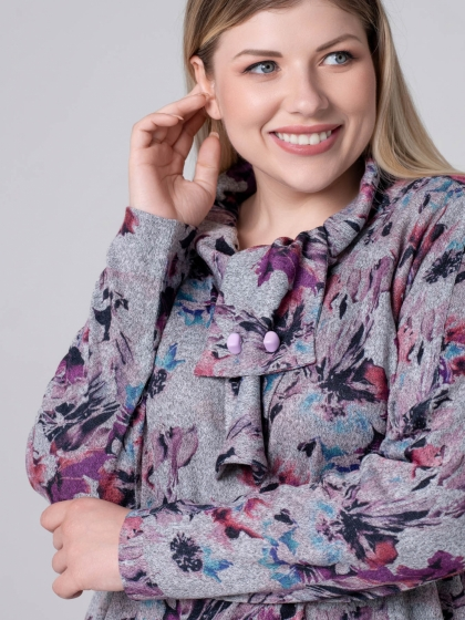 Эффектный джемпер свободного силуэта выполнен из мягкого трикотажного полотна с абстрактным рисунком, выполненным в технике Digital. Модель с круглой горловиной, оформленной мягкой стойкой , которая на левой стороне полочки переходит в небольшой галстук. Свободные стороны галстука можно зафиксировать декоративной булавкой, формируя степень прилегания и форму узла. Рукав длинный, зауженный к низу. Этот джемпер - идеальный выбор для тех, кто ценит комфорт и хочет выглядеть оригинально.