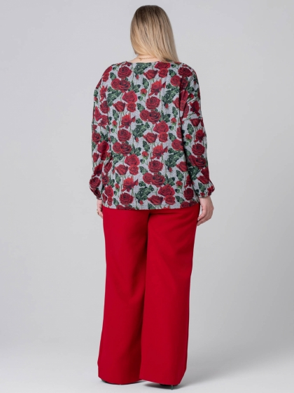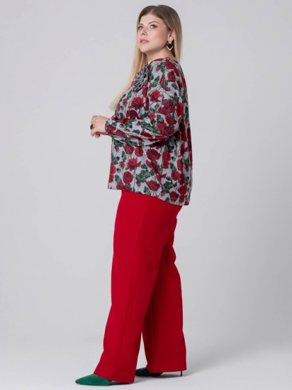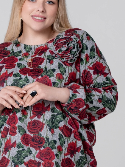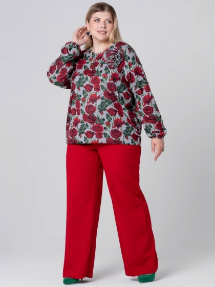 Эффектный джемпер свободного силуэта выполнен из мягкого трикотажного полотна с цветочным рисунком, выполненным в технике Digital. Красные цветы какое-то время назад предлагались женщинам в основном в виде принтов на летних вещах. Теперь пора отойти от традиций и порадовать милых дам новыми декоративными решениями. Модель с круглой горловиной и удлиненной линией плеча. Рукав длинный, объемный к низу присобран на эластичную тесьму. На полочке расположена 3D аппликация, которая дополняет образ. Этот джемпер - идеальный выбор для тех, кто ценит комфорт и хочет выглядеть оригинально.