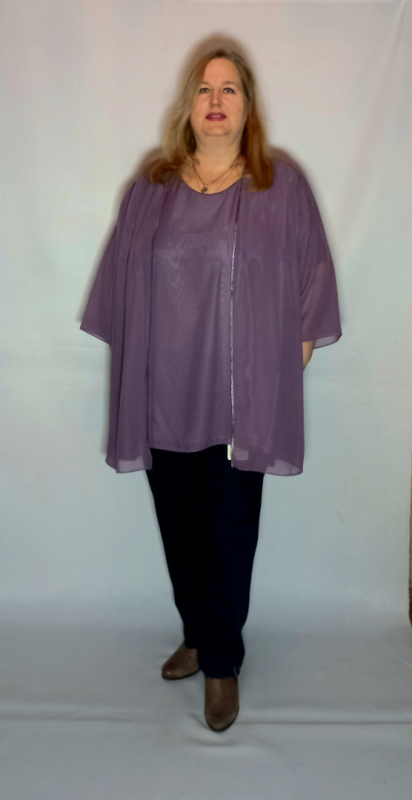 Комплект состоит из кардиган и блузы. Выполнены из креп шифона. Ткань тонкая, но не рыхлая, воздушная, не эластичная, приятная и дышащая.