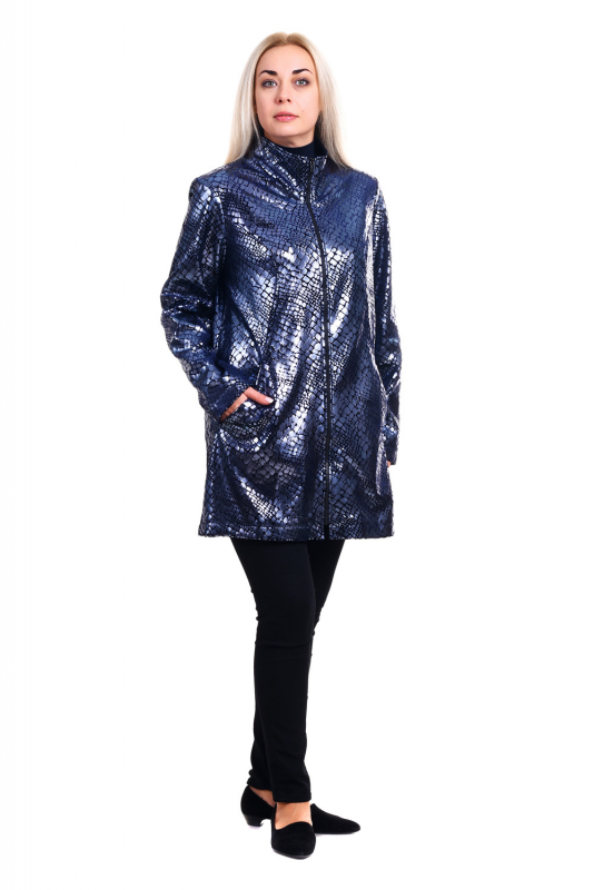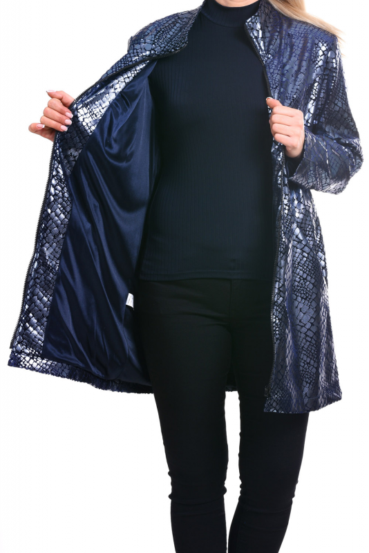 Эффектная стильная удлинённая куртка из прочной ткани с рельефным мерцающим принтом, имитирующим кожу рептилий.