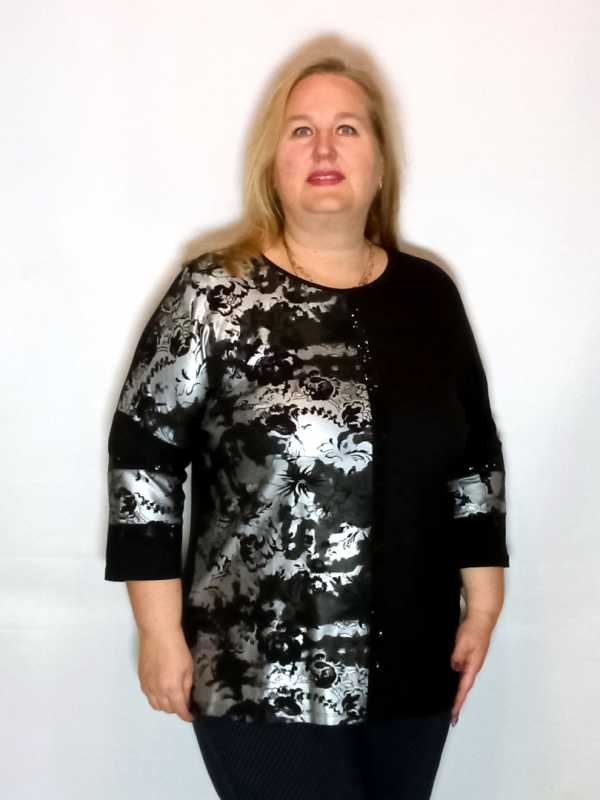 Рукав 3/4, спущенное плечо, декорирован вставкой из трикотажа с принтом и термостразами черного цвета