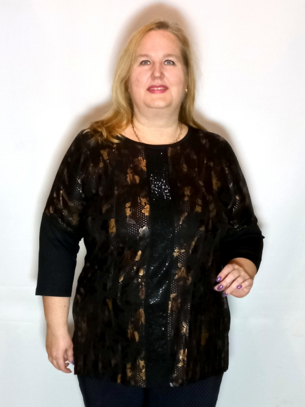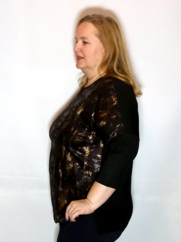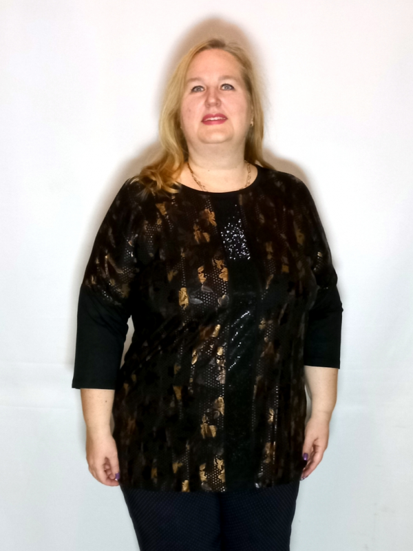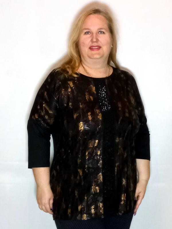 Полочка  сложнокроенная, основная часть из трикотажа с рисунком, по середине вставка вертикальной полосы из однотонного трикотажа, которая декорирована черными термостразами.