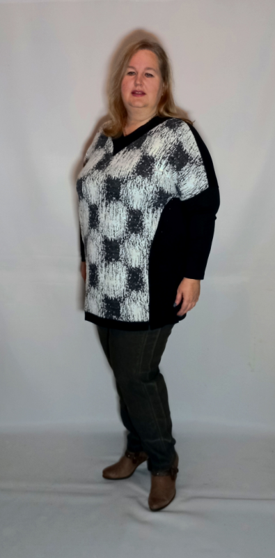 Полочка сложнокроенная: боковые вставки черного цвета, декорированы черными термостразами. Средняя часть полочки из трикотажа "альпака"