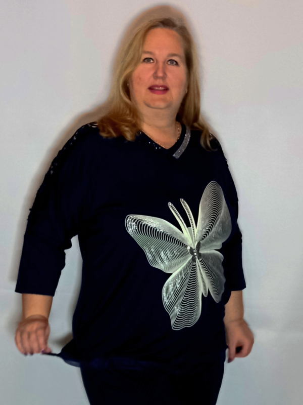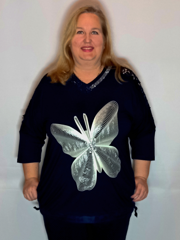 Вырез горловины V - образный, декорирован синими и серебристыми стразами.