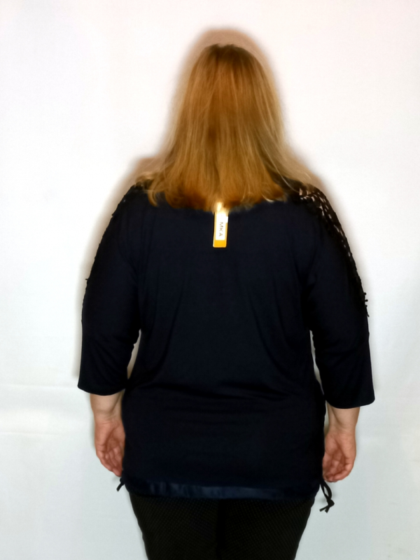 Рукав 3/4, спущенное плечо. На плече декор плетенным кружевом.